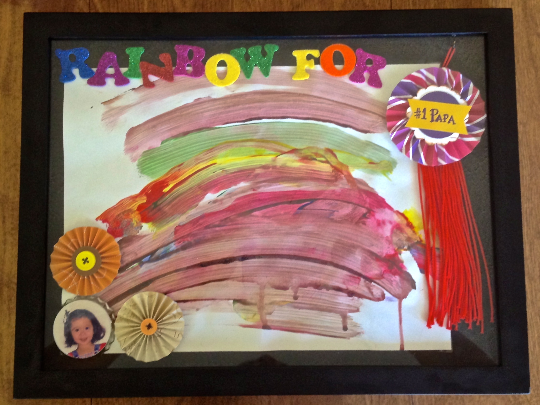 It was about a week ago, Abigail painted a rainbow for her Papa. So I thought that it would be a great gift for him. And then on Saturday we went to an outlet store called Ollie’s in Huntington, WV just to check it out what they had. Then I saw this kind of frame (actually for a graduation gift) that sort of like a craft / scrapbooking frame. Then an idea came up in my mind what I would like to make for Father’s Day gift for our special Papa.