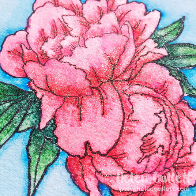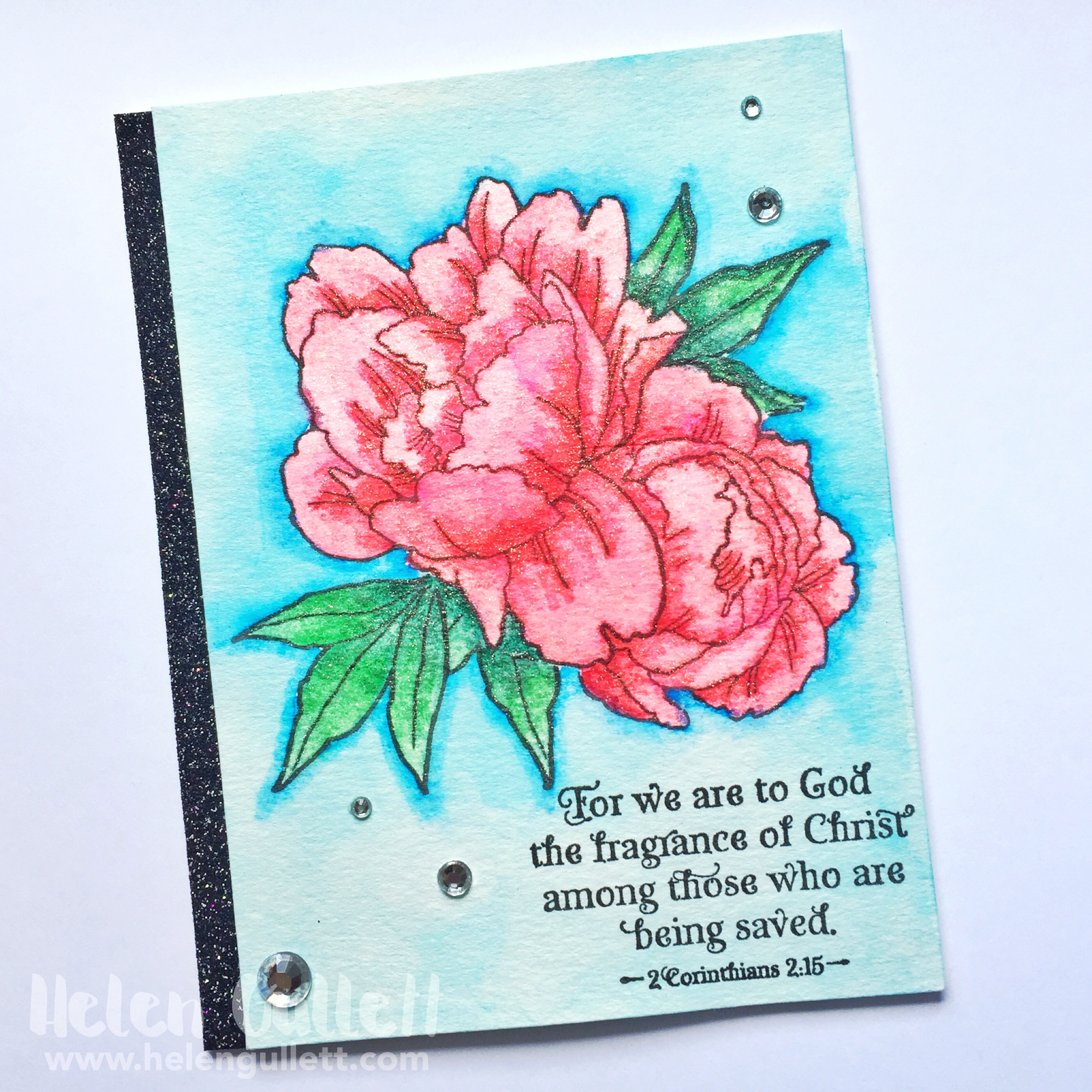 I trimmed down the watercolored panel a little bit, then added it on the card with the American Craft – Black Glitter ribbon. I used lots of adhesive runner on the back of the panel to make sure it stick well amd flat. Then I decided to add some glitter on the blooms with Wink Of Stella glitter brush for more sparkle amd shine π I finished it with some of the gems from Hampton Art.