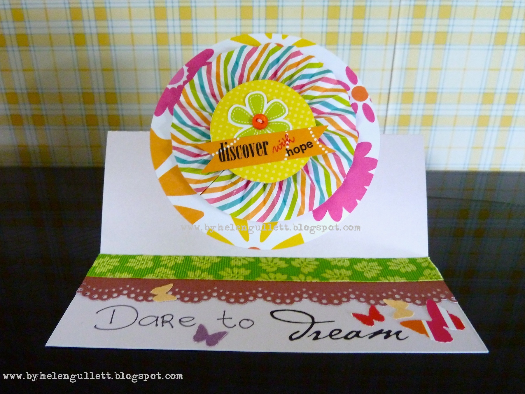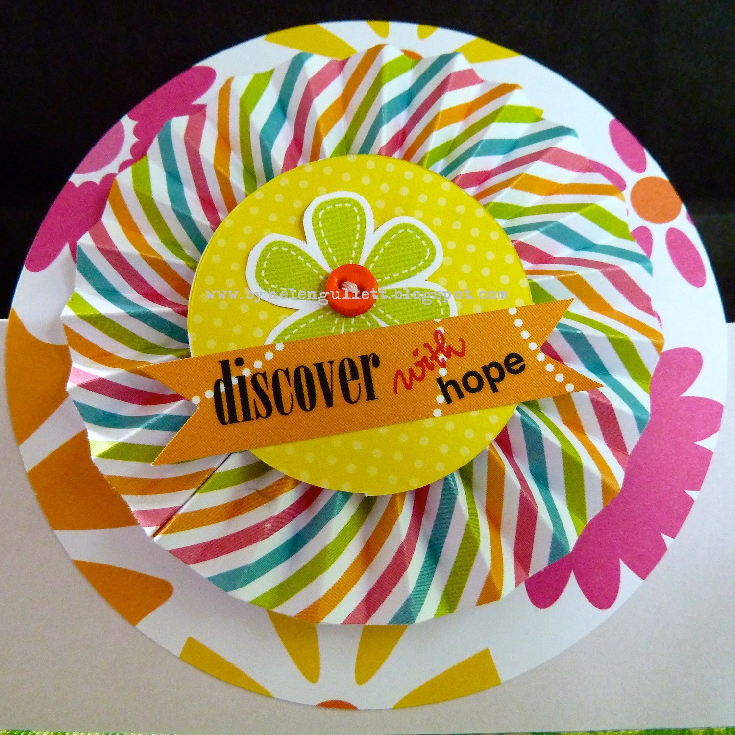 The front card decoration: Martha Stewart Circle Cutter, paper from Walmart, discover and hope rub-ons, flower cut from the paper and button hand-sewed