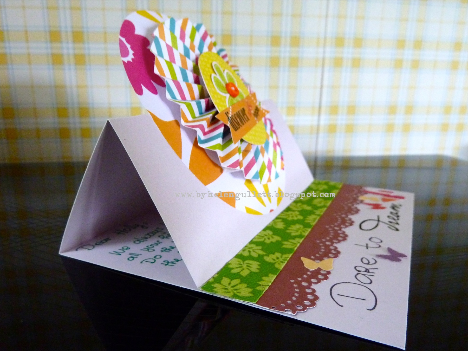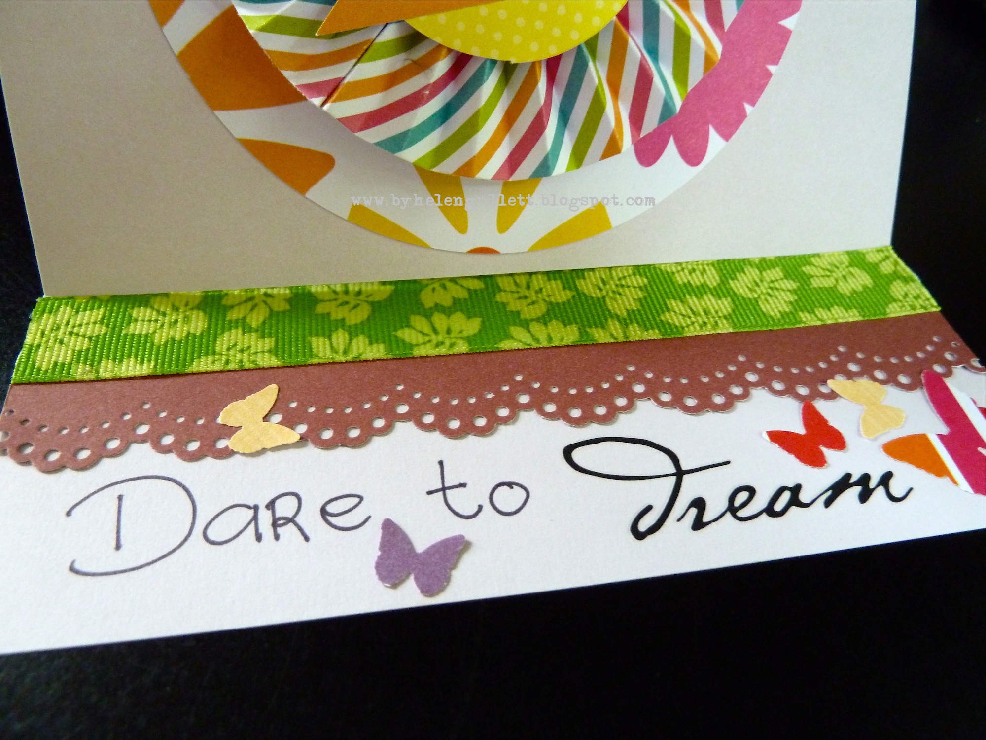 Inside Card: Border punched using Martha Stewart Punch, Paper Studio Ribbon from Hobby Lobby, hand writing "Dare to", rub on "dream, Martha Stewart Classic Butterfly punch.