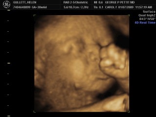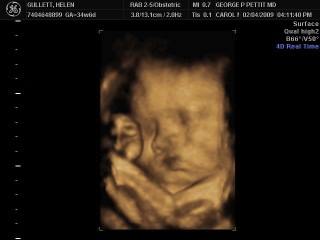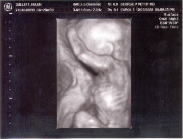 Ini adalah hasil foto yang diambil saat pemeriksaan dengan USG yang kedua kali. Saat itu, bayi saya berusia 20 minggu. Kami sudah berada di Amerika dan mesin yang digunakan adalah 3D/4D Ultrasonography dengan layar TV yang besar sekali dalam ruangan pemeriksaan. Juga, kami bisa mencetak foto-foto hasil USG langsung saat itu.