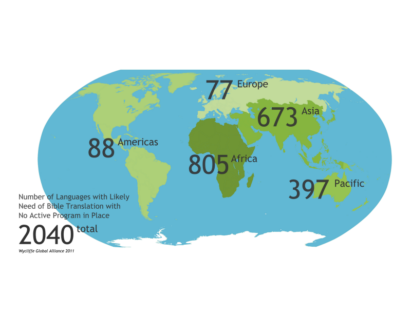 Work is in progress for many of the communities who have none of God’s Word in their language or insufficient Scripture. Current estimates suggest around 350 million people speaking 2040 languages may have a need for Bible translation to begin.